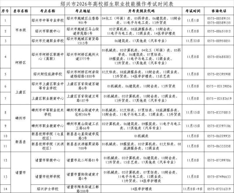 绍兴市2026年高校招生职业技能操作考试时间如下: