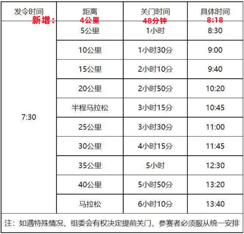 为保证选手比赛安全和城市道路交通秩序,各公里点关门后,比赛计时感应地毯即停止工作,赛道解除交通管制并恢复正常交通,选手应及时停止比赛退出赛道,等候组委会援助车或乘坐公共交通车辆抵达终点。否则由此引发的事故将由该名选手自行承担相应法律责任和赔偿责任。