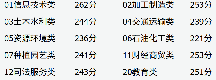 信息技术类、加工制造类、土木水利类、交通运输类、资源环境类、石油化工类、种植园艺类、财经商贸类、司法服务类、教育类录取时,职业技能考试合格的考生,在各专业录取最低控制分数线上,按考生文化素质总成绩和志愿,从高到低投档,由招生院校择优录取。