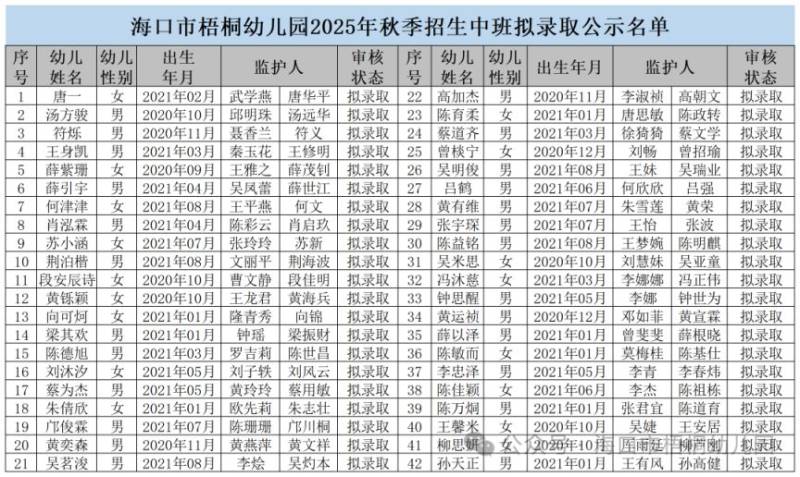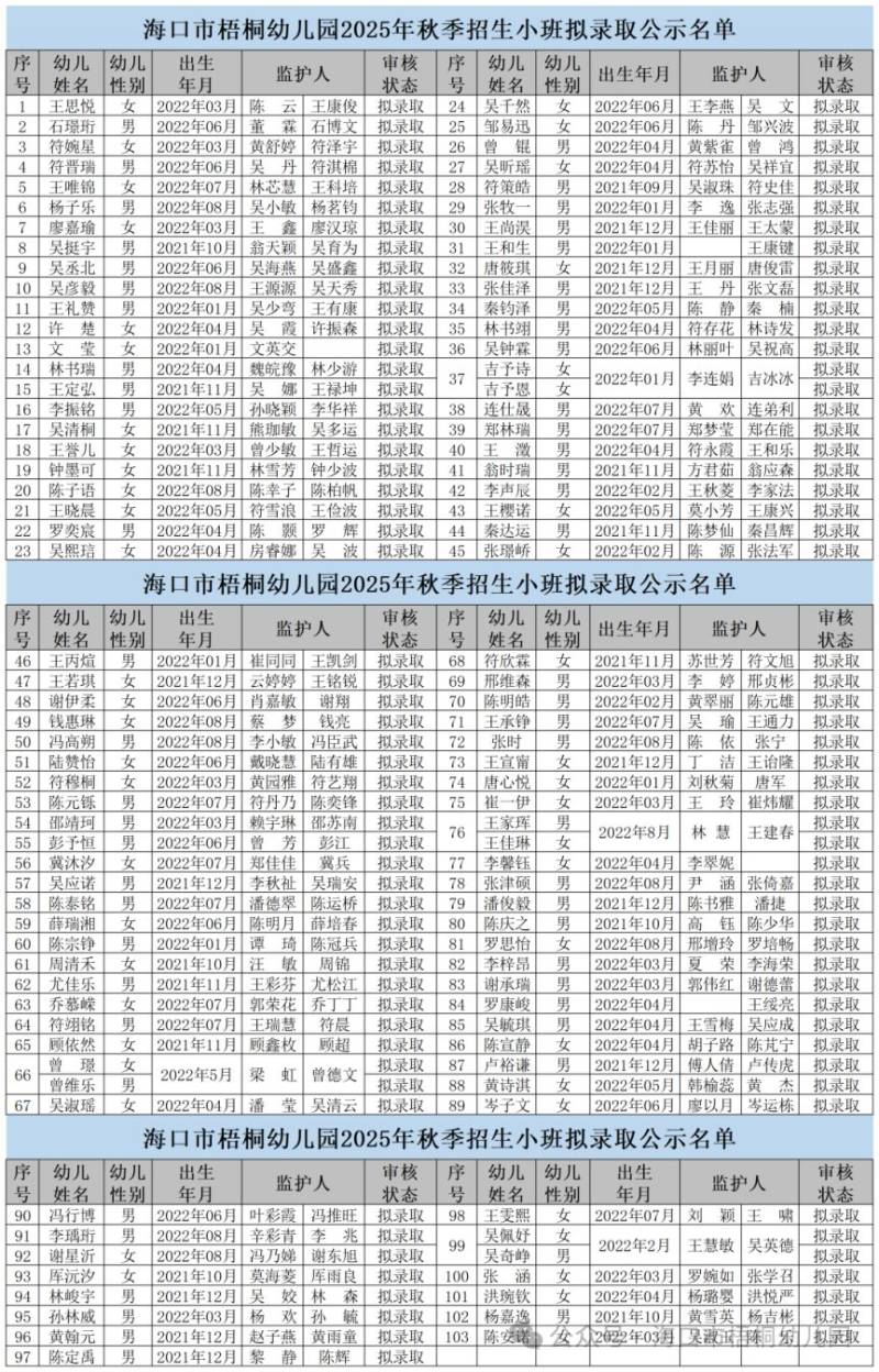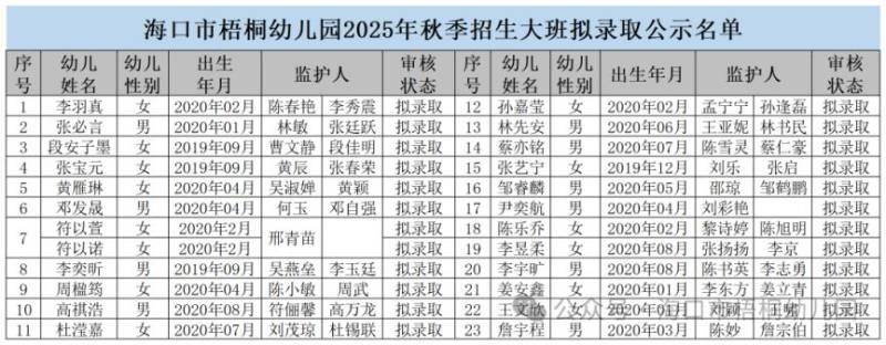 海口市梧桐幼儿园(总园)2025年秋季招生拟录取结果公示