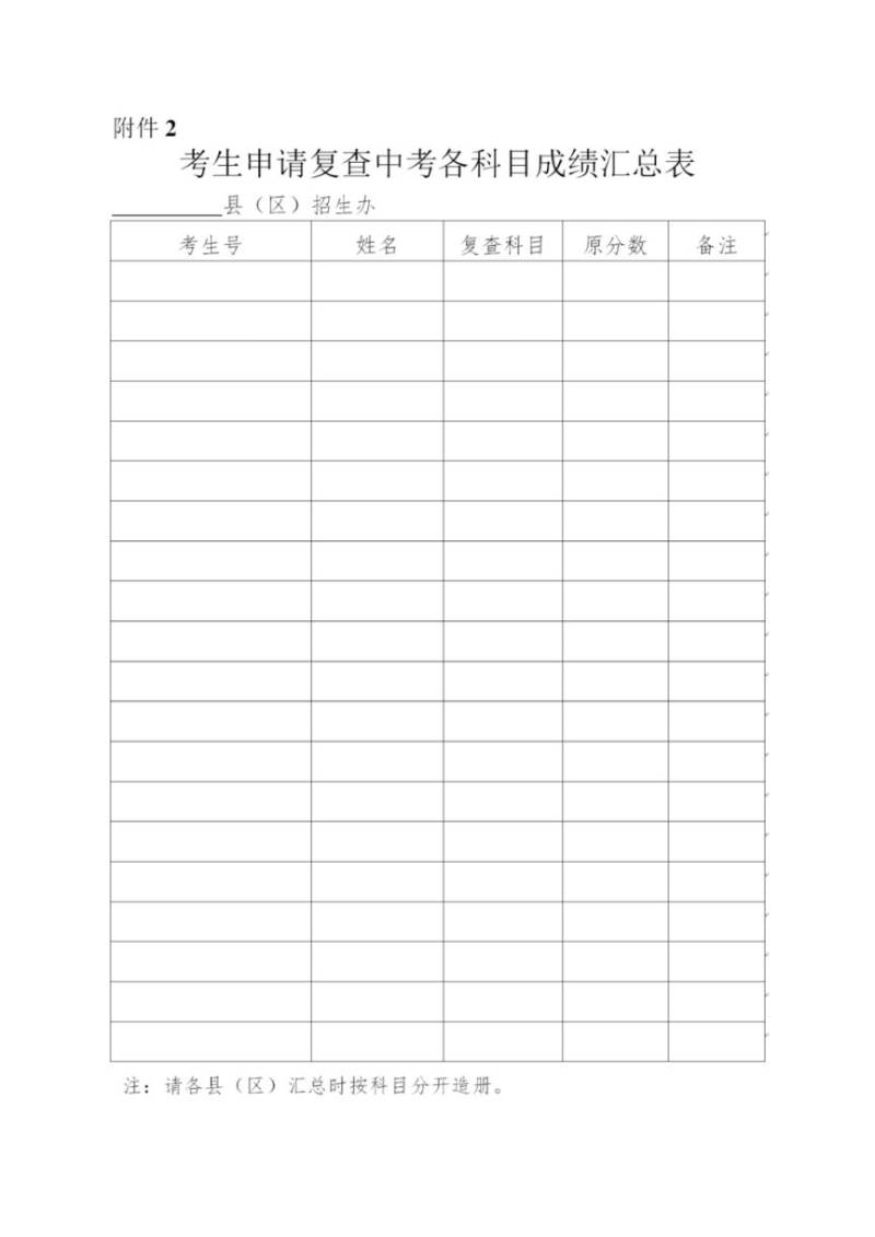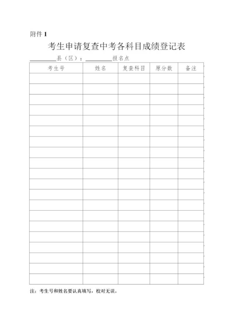 二、复查方式:携带准考证到报名点提出复查分数的书面申请,并按复查科目填写《考生申请复查中考各科目成绩登记表》(附件1)。