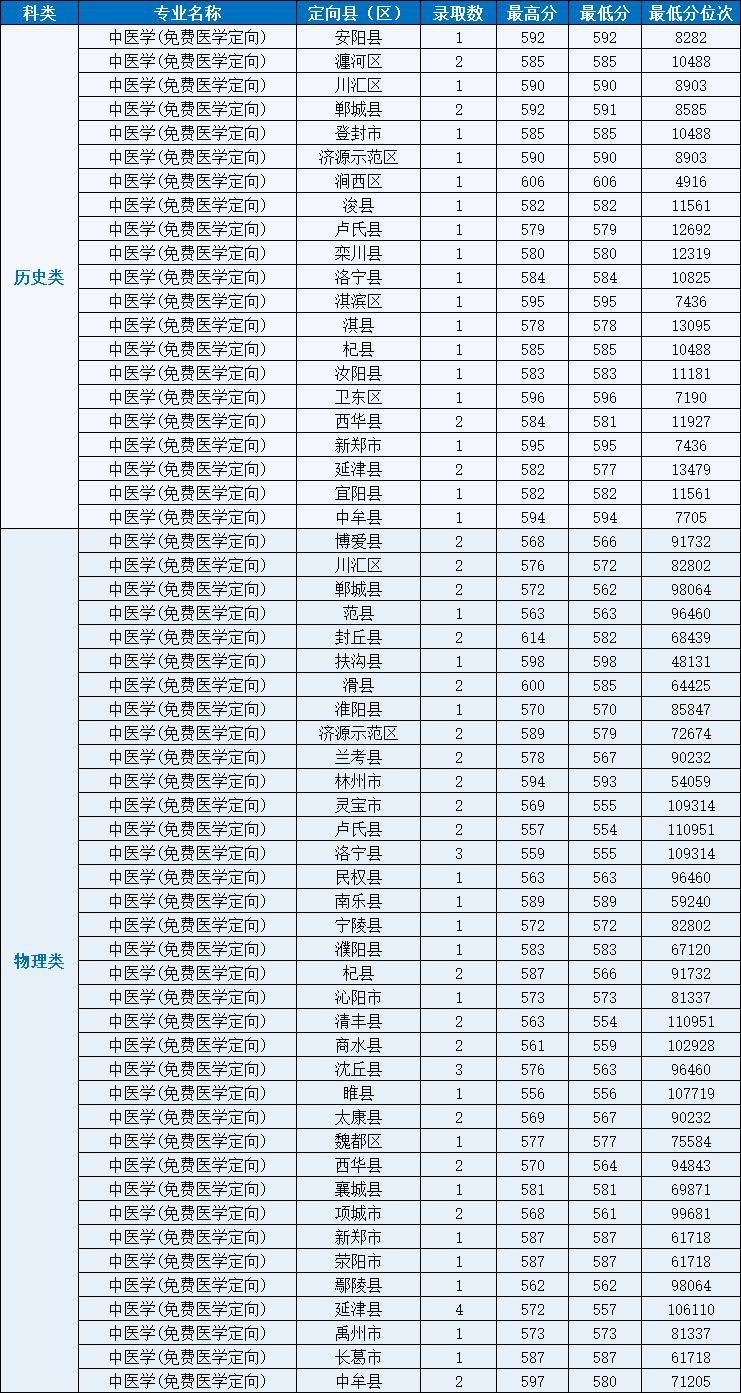 其中:中医学(免费医学定向)共录取85人。历史类录取25人,最高分606分,最低分577分;物理类录取60人,最高分614分,最低分554分。