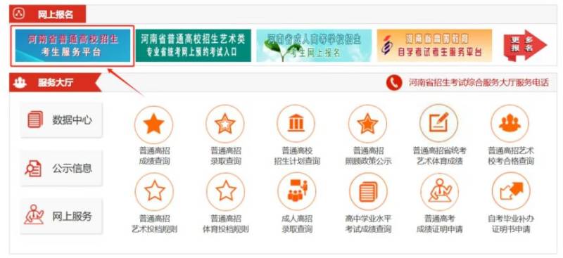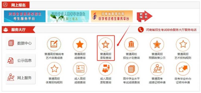 进入“河南省教育考试院网站(http://www.haeea.cn/)”,点击“河南省普通高校招生考生服务平台”进行查询。