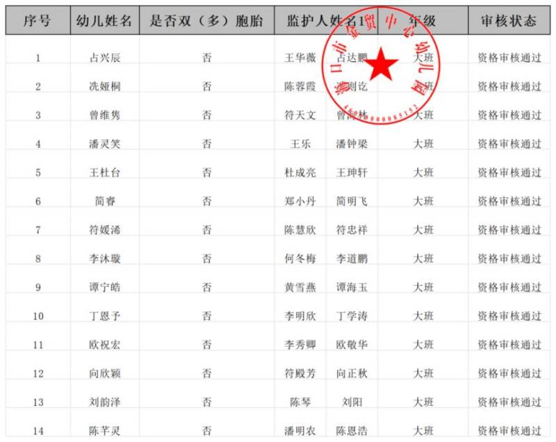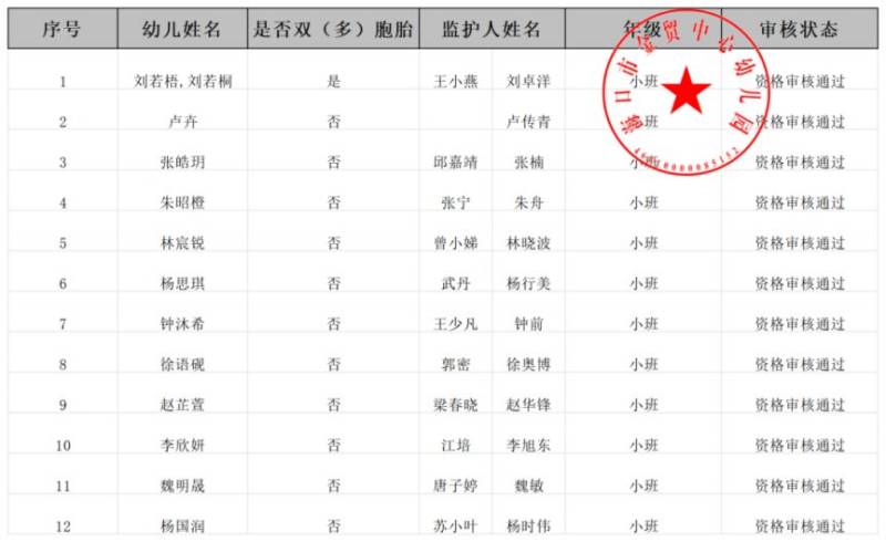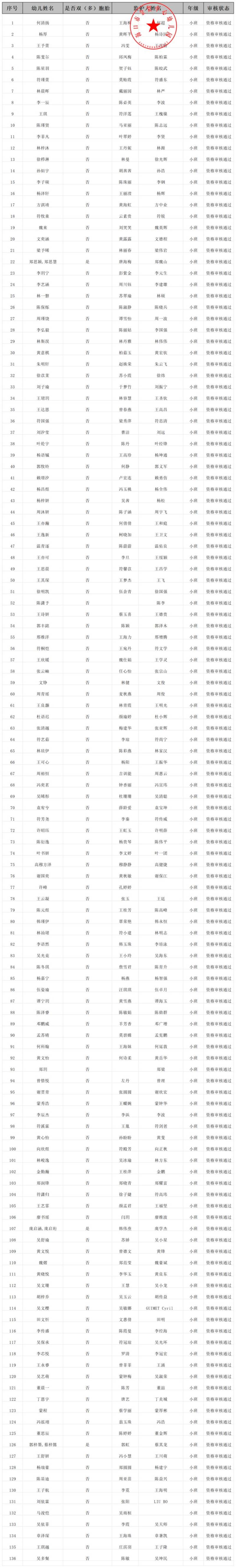 根据《海口市龙华区2025年秋季幼儿园招生工作方案》,海口市金贸中心幼儿园总园2025年秋季学位申请信息初审工作已结束。经过线上审核校验,小区配套业主子女入园资格审核通过幼儿信息12条(含1对双胞胎),非小区配套业主子女入园资格审核通过幼儿信息150条(含3对双胞胎),其中小班136条(含3对双胞胎),大班14条,不通过幼儿信息1条,现将资格审核通过名单公示如下:(如后续发现信息或材料弄虚作假、填写错误,同样取消摇号或入园资格)。