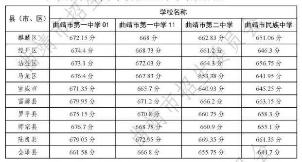 曲靖市第二中学四区一体化录取最低分为661.13分;