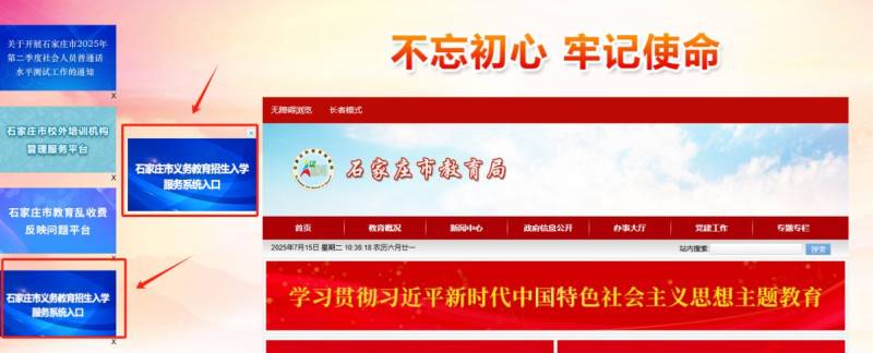 1、家长登录市教育局官方网站(http://sjzjyj.sjz.gov.cn/链接进入)或通过“石i民”App【义务教育入学】功能,进入“石家庄市义务教育招生入学服务系统”。
