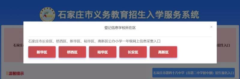 2、点击【石家庄市长安区、桥西区、新华区、裕华区、高新区公办小学一年级网上信息采集入口】选择登记学校所在区,然后选择【公办小学一年级报名】,进入后选择符合条件的拟登记学校进行填报。