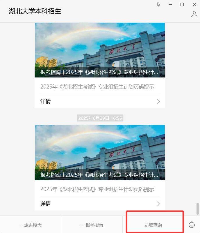 微信搜索关注“湖北大学本科招生”微信公众号,点击菜单栏中的“录取查询”,即可进入查询页面。