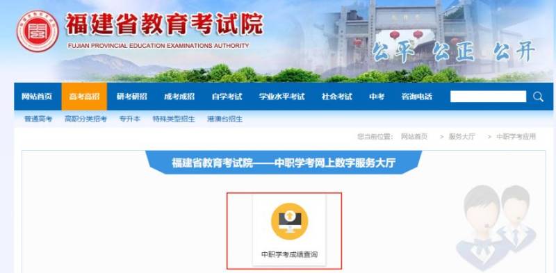 如果以上系统打不开,也可以通过福建省教育考试院官网(https://www.eeafj.cn/),数字服务大厅-中职学考-中职学考成绩查询这个流程进入系统!