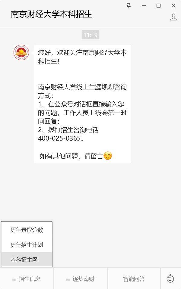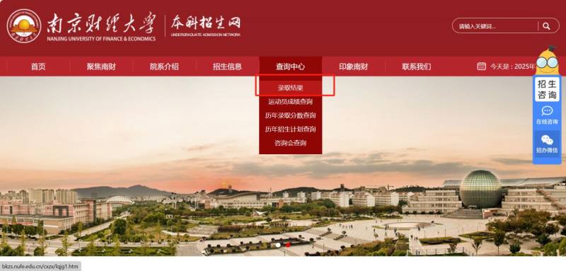 关注南京财经大学本科招生公众号,点击菜单栏中的“本科招生网”,即可查询。