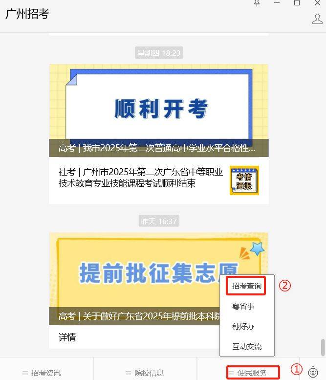 2.微信查询--手机通过”广州招考"官方微信,点击”便民服务一招考查询”栏目进行查询。