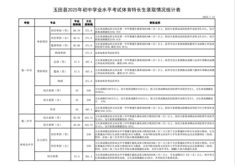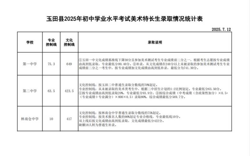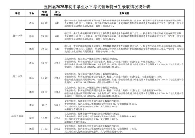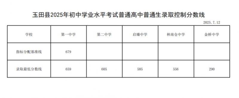 唐山玉田县普通高中学校录取分数线