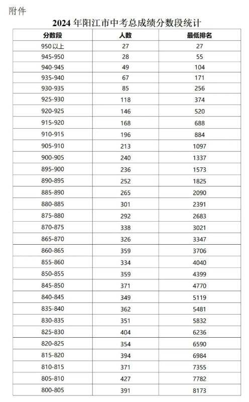 2025年阳江市中考一分一段表尚未公布,现提供2024年阳江市中考一分一段表参考。