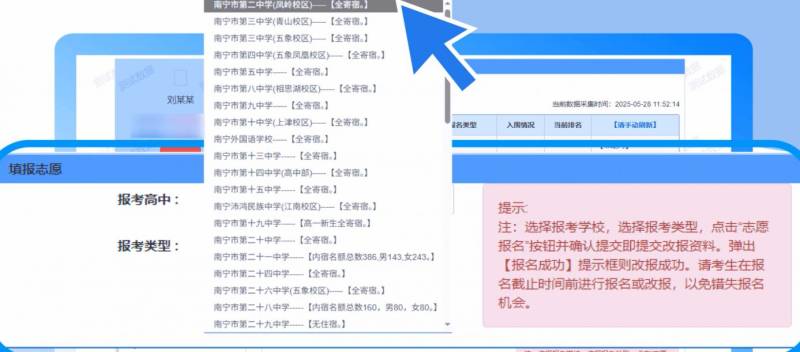 如需更改志愿,以改报二中为例,选择南宁二中(凤岭校区)并点击【我要报名】即可。