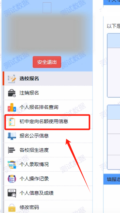 2、若需查询初中定向名额使用信息,可点击页面左侧【初中定向名额使用信息】,可查看考生所在初中定向名额使用信息,包含定向配额数、已使用数等。