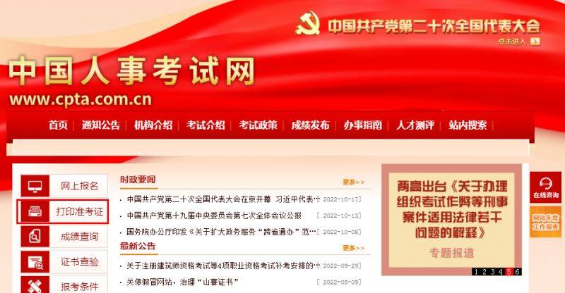 第一步,考生需登录中国人事考试网(http://www.cpta.com.cn/),在网站左侧知道“打印准考证”按钮,如图所示: