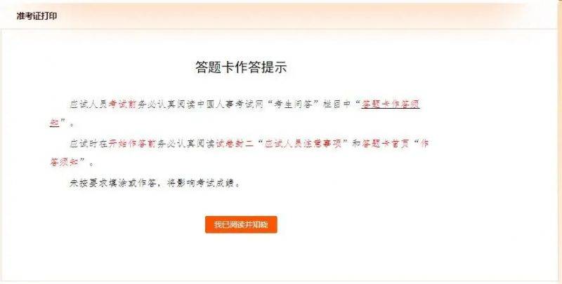 第四步,点击“我已阅读并知晓”进行确认,可进入到社会工作师考试准考证打印界面,选择自己的报考省市、证件类型,输入证件号码和姓名,点击确认可进行打印。