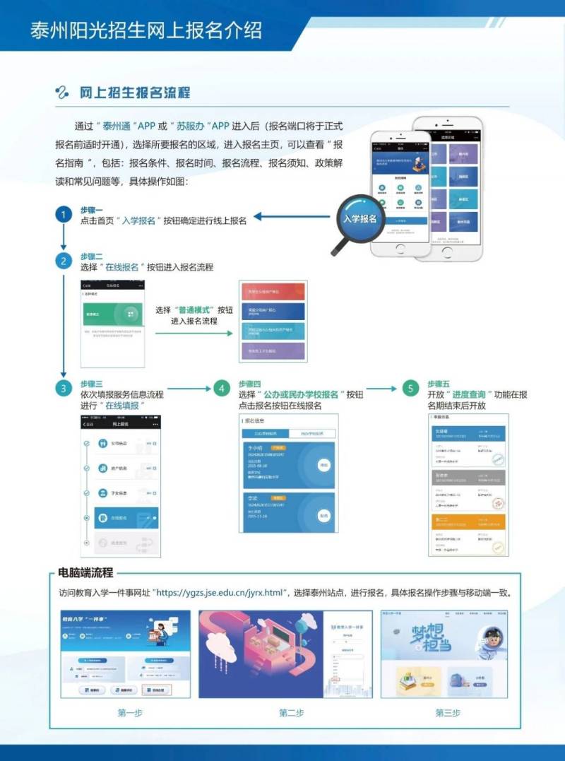 今年,我市各公办义务教育学校继续通过“泰州市义务教育阶段学校阳光招生报名平台”招生,实行报名、材料审核和录取一网通办。
