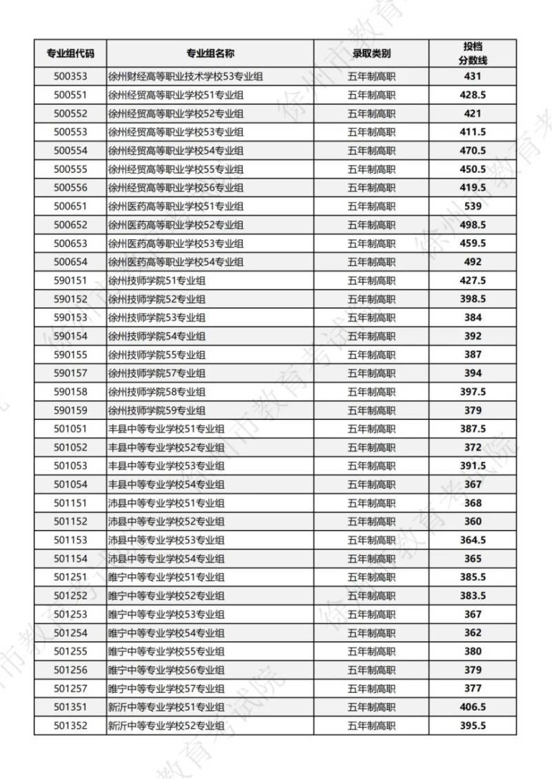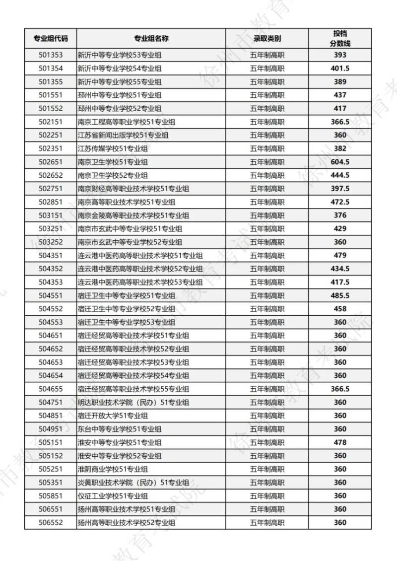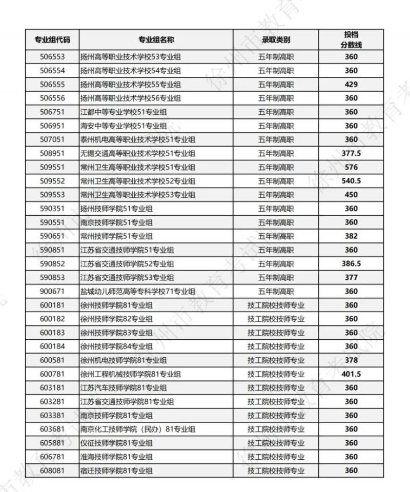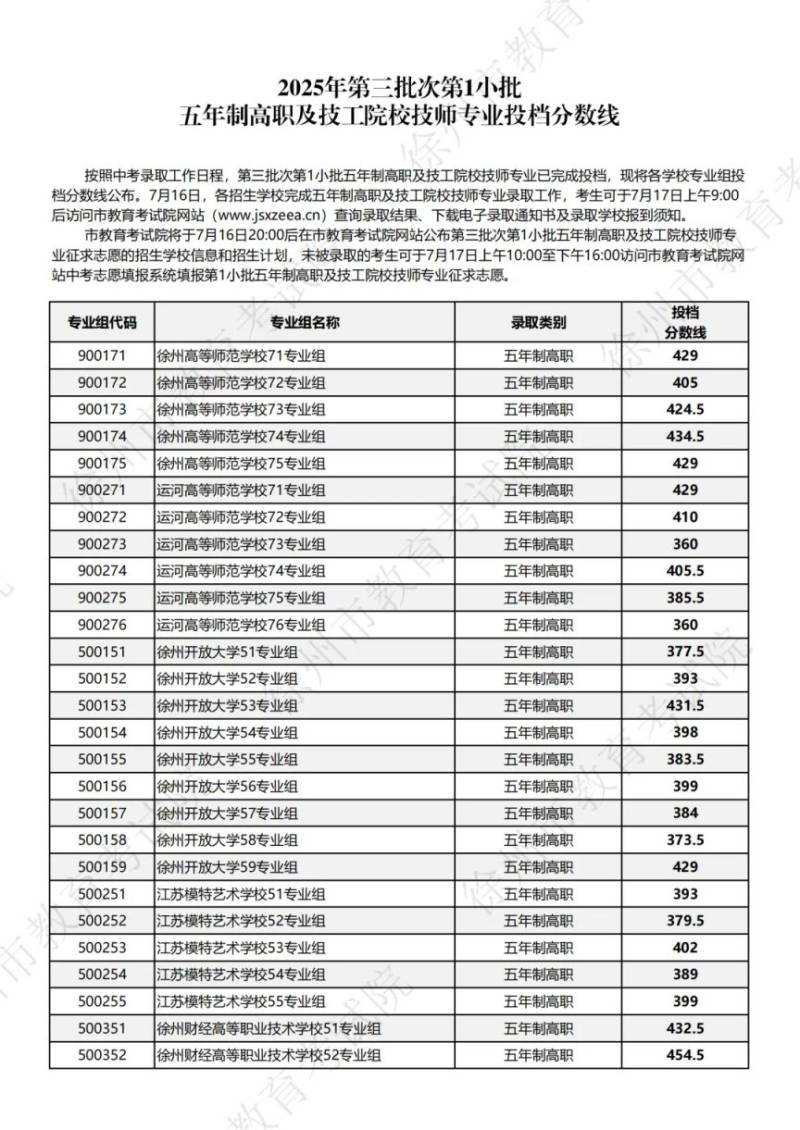 2025徐州中考第三批次第1小批五年制高职及技工院校技师专业投档分数线