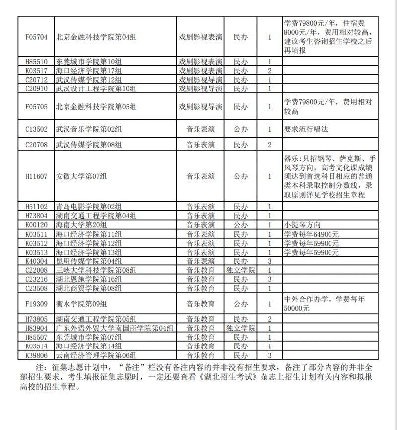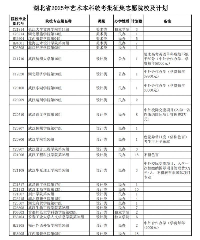 2025湖北高考艺术本科批征集志愿院校名单及计划