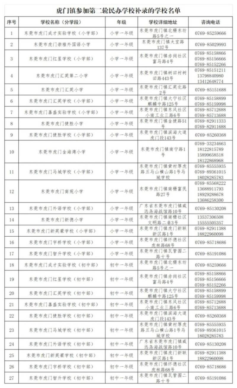 虎门镇参与第二轮民办学校补录的学校名单见下表。第二轮补录将根据申请情况额满为止,民办学校补录学位满员后不再接受补录申请。家长可联系民办学校了解学位情况和学校基本情况,也可以通过扫描以下二维码了解学校的办学情况、收费标准、服务设施后合理申请补录,勿扎堆申报个别民办学校。