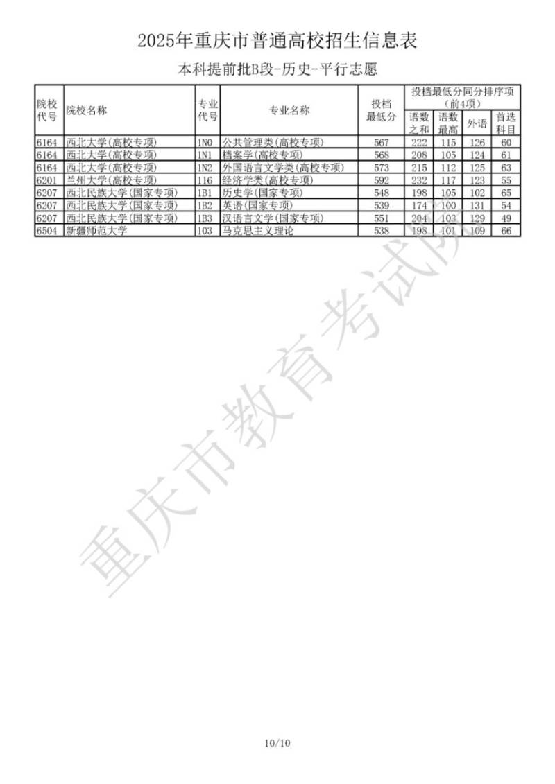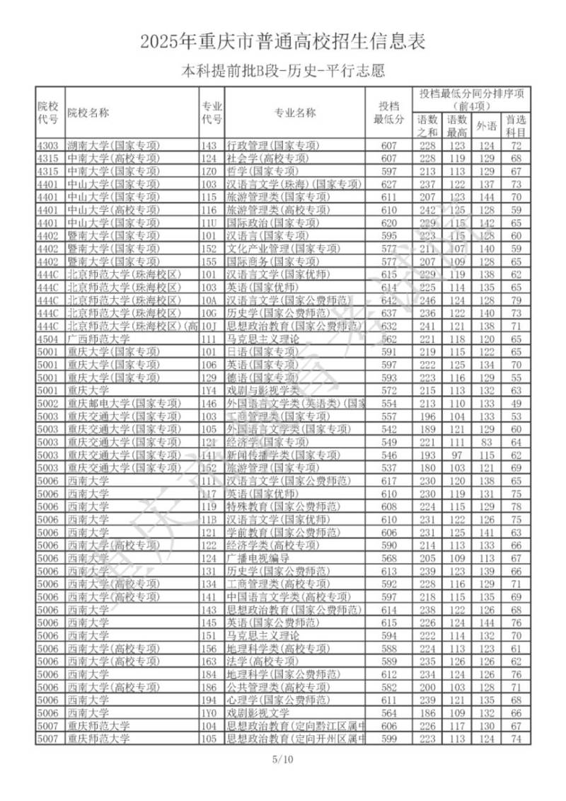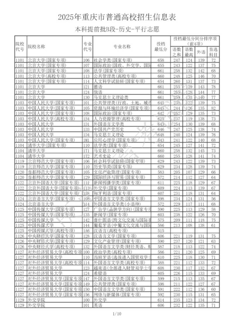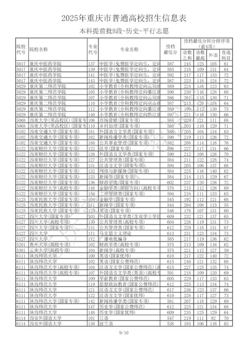 2025年重庆市普通高校招生信息表 普通类本科提前批B段(历史类)