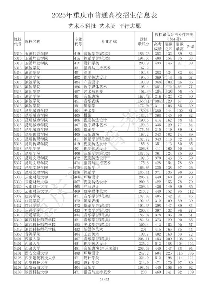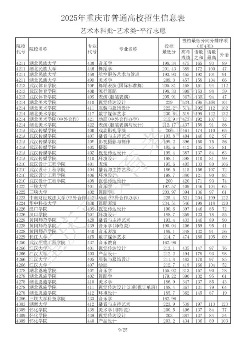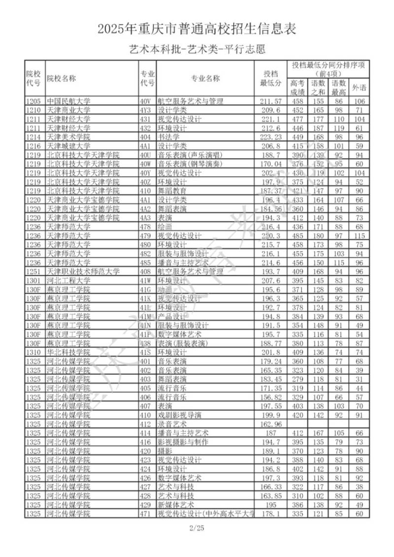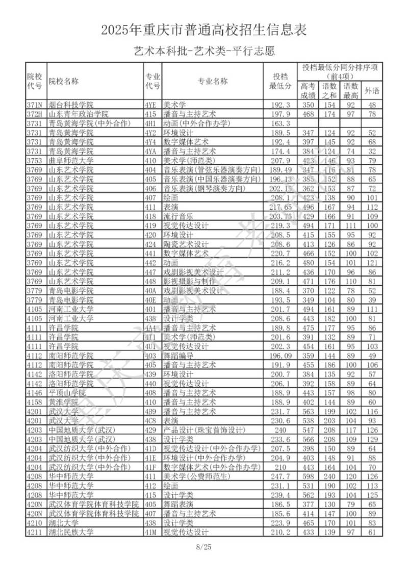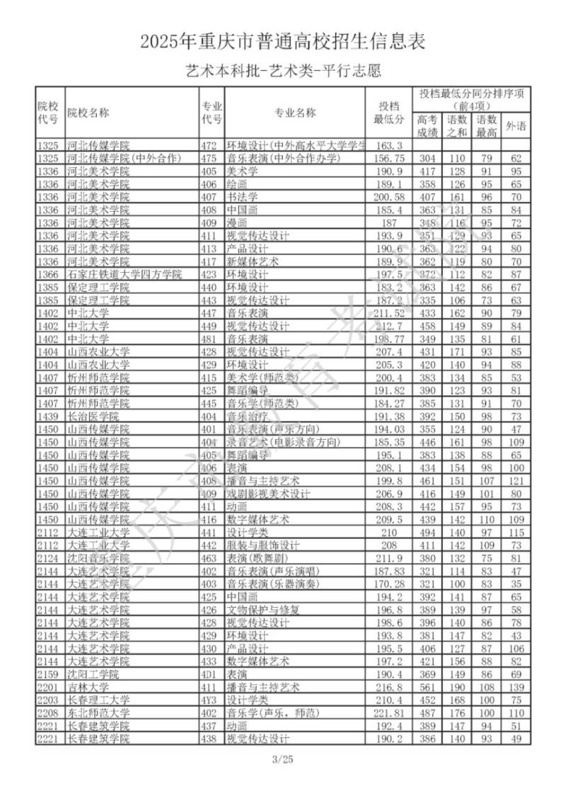 2025年重庆市普通高校招生信息表 艺术本科批