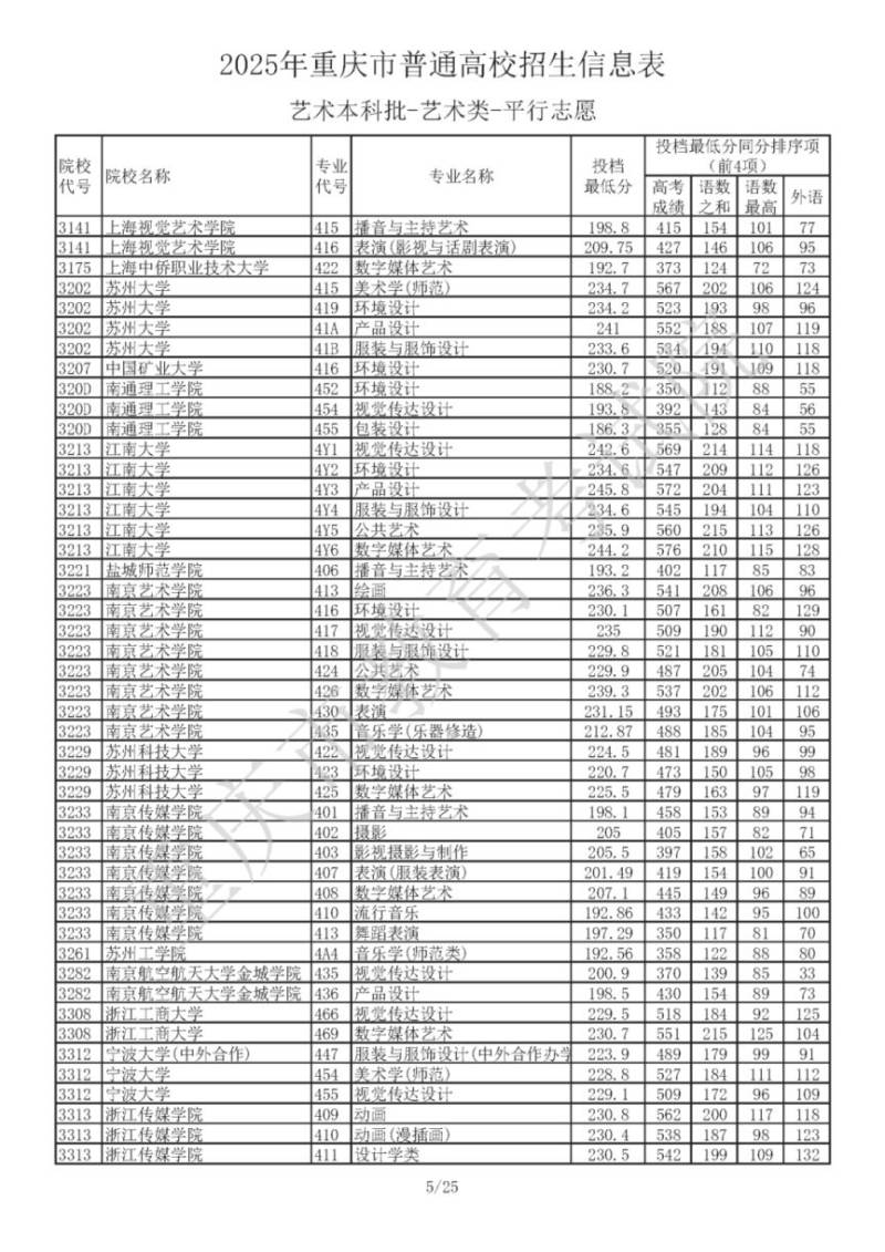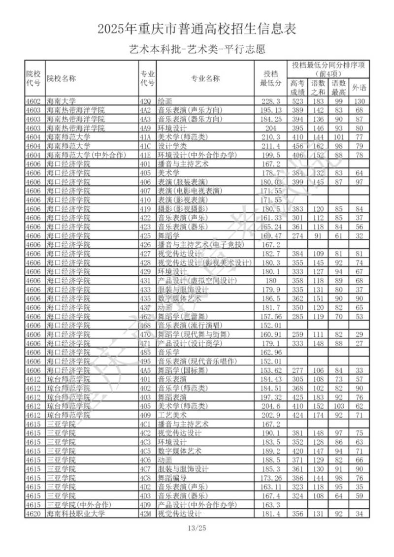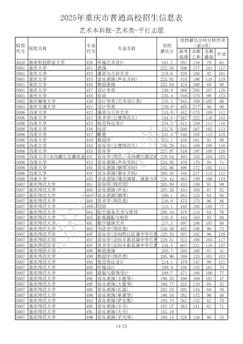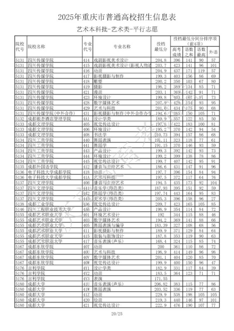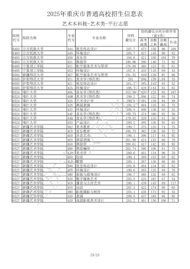 2025年重庆市普通高校招生信息表 艺术本科批