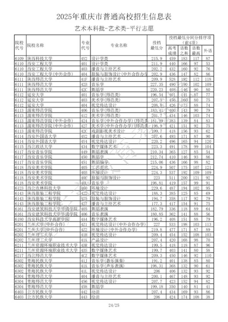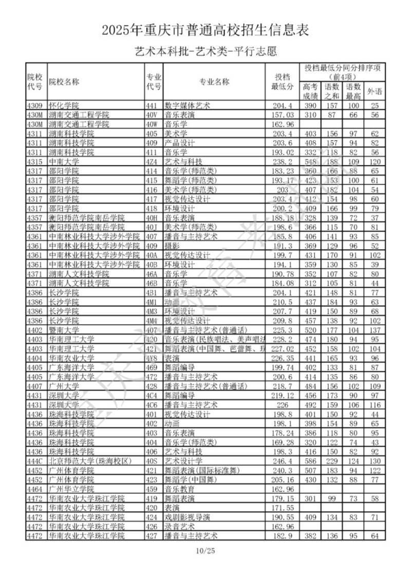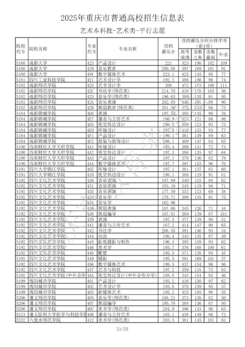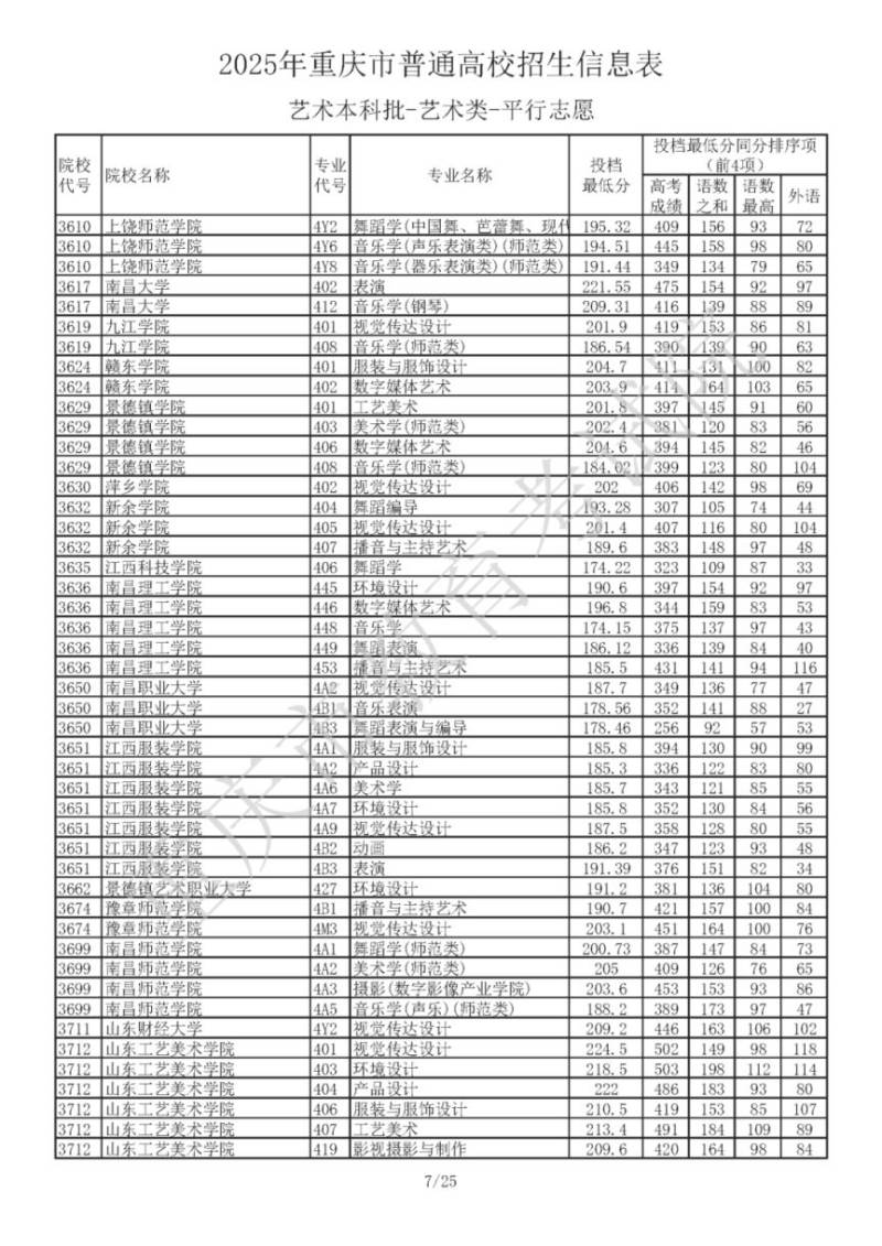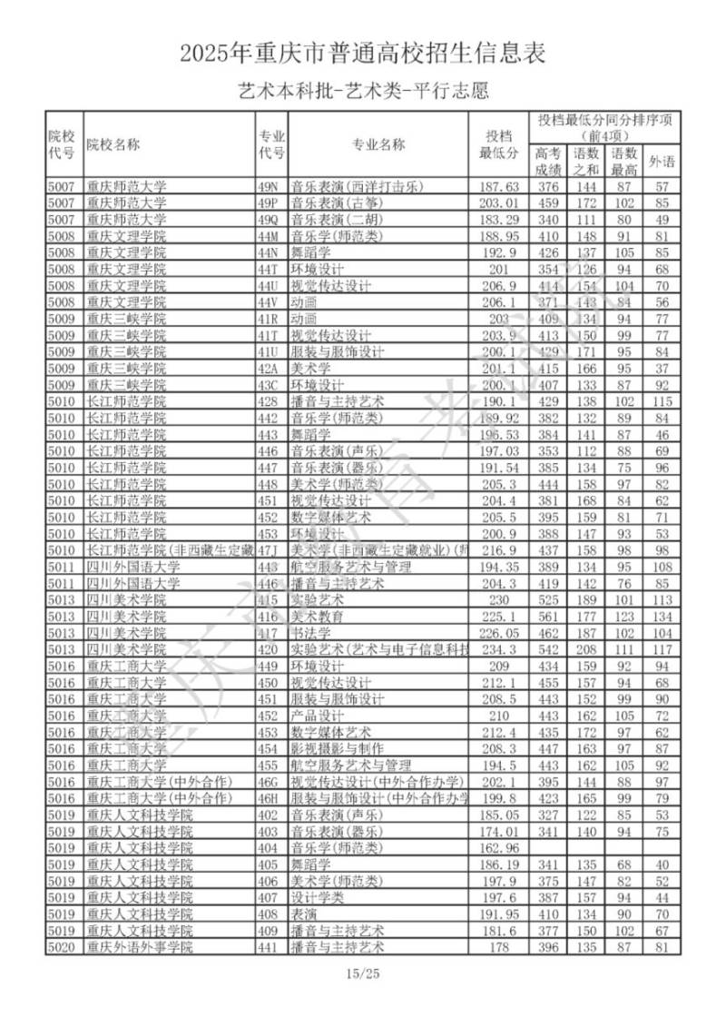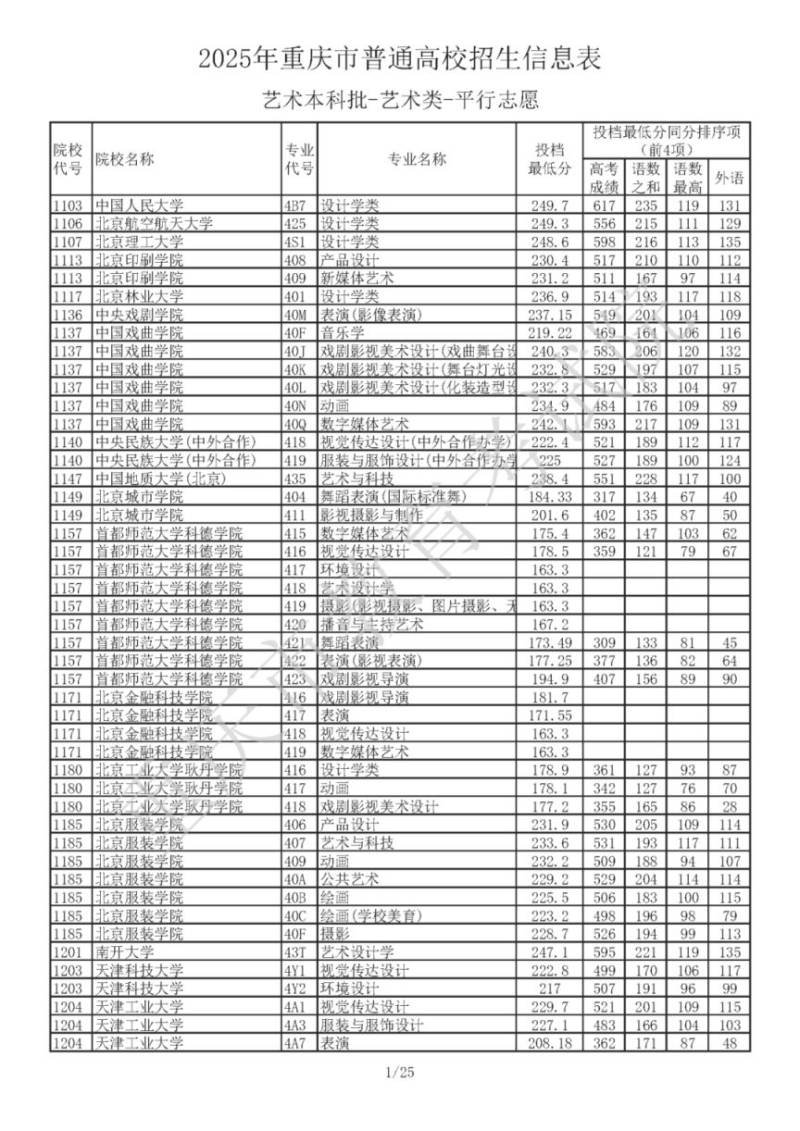 2025年重庆市普通高校招生信息表 艺术本科批