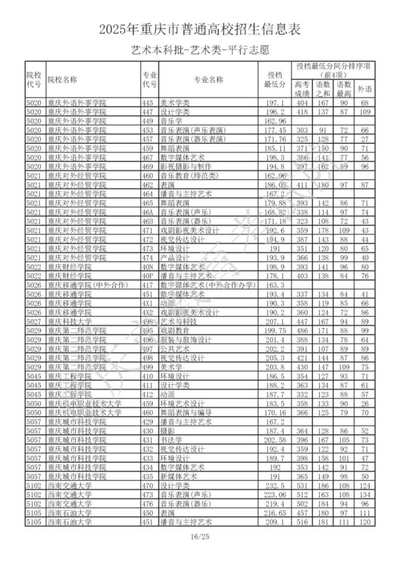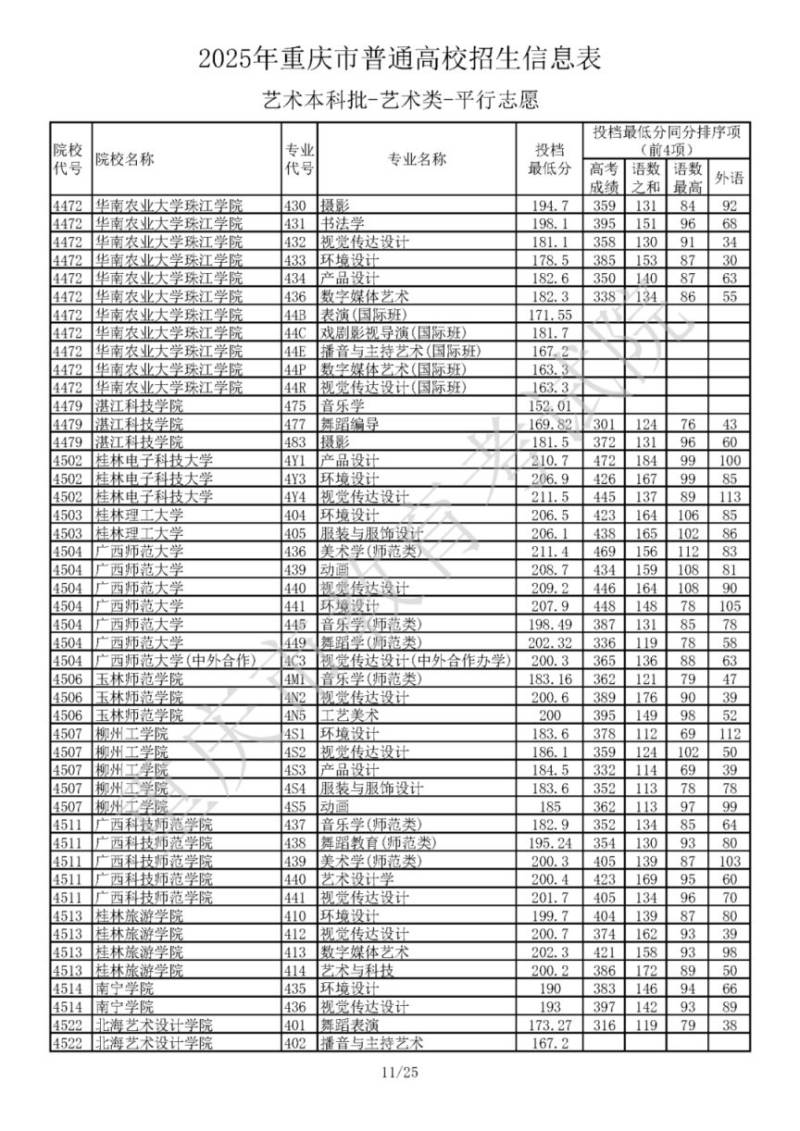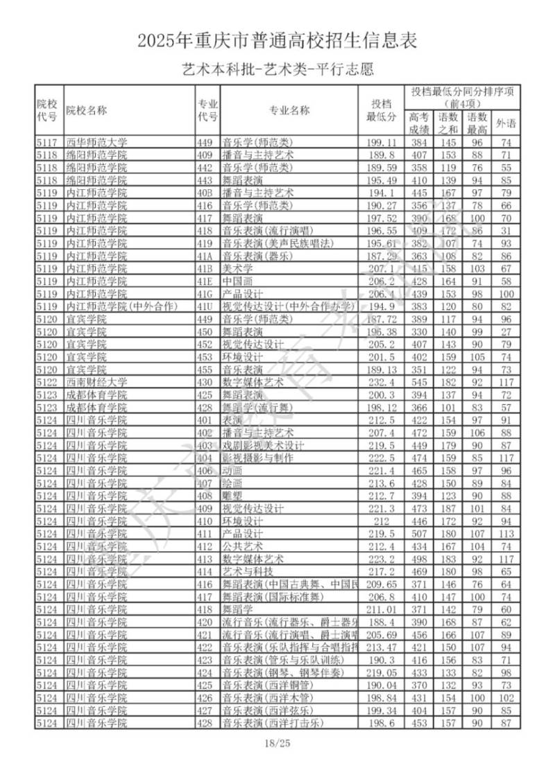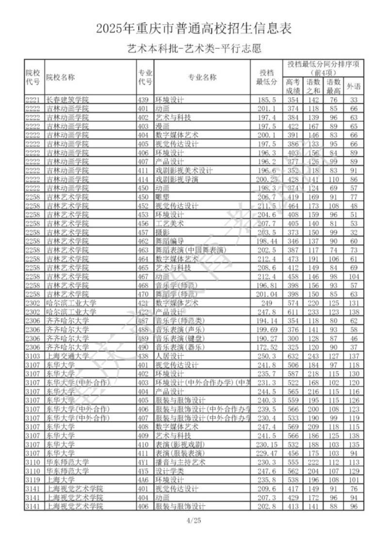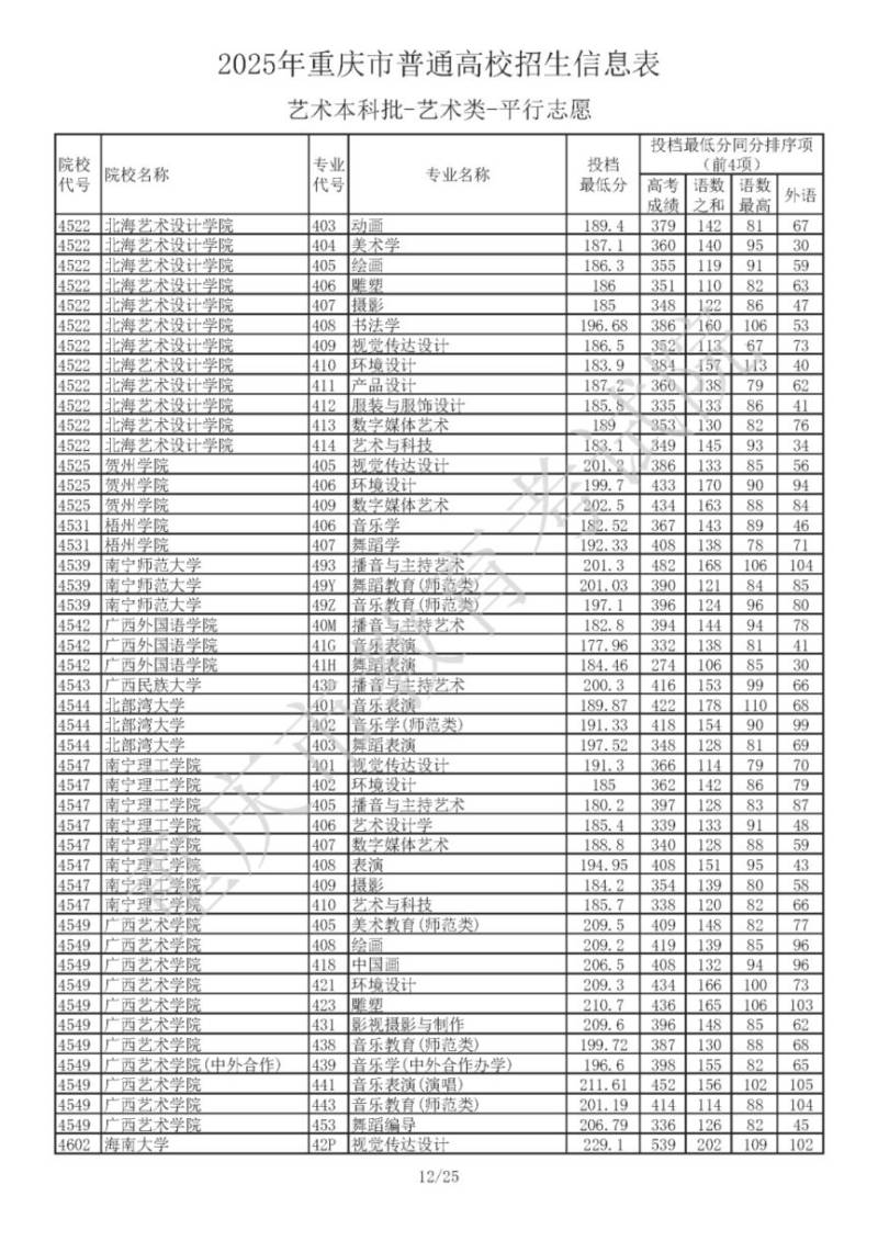 2025年重庆市普通高校招生信息表 艺术本科批