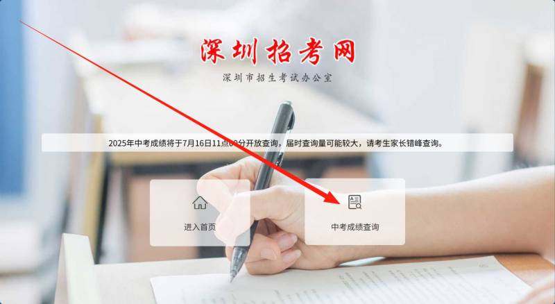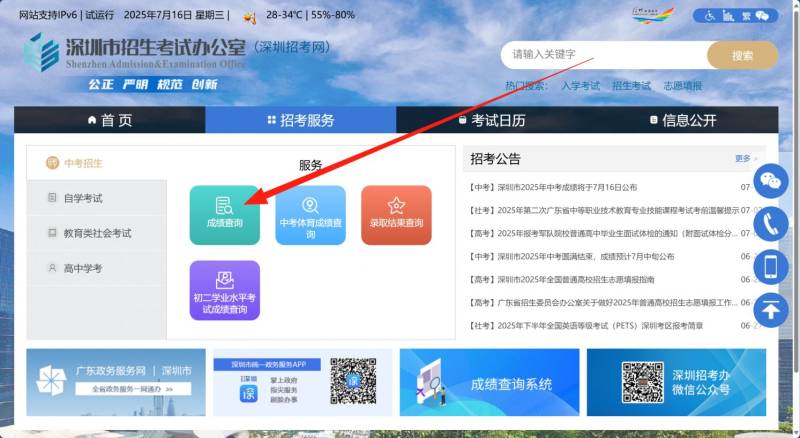 在深圳中考成绩公布前后几天里,由于查询量可能较大,所以我们进入深圳招考网官网后会显示下图,只需要按下图箭头所示直接点击中考成绩查询,即可进入深圳中考查分界面