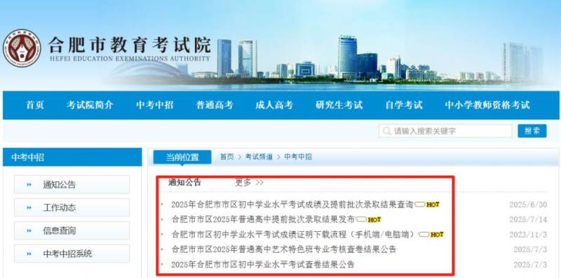 录取查询入口:2025年合肥市市区初中学业水平考试成绩及录取结果查询