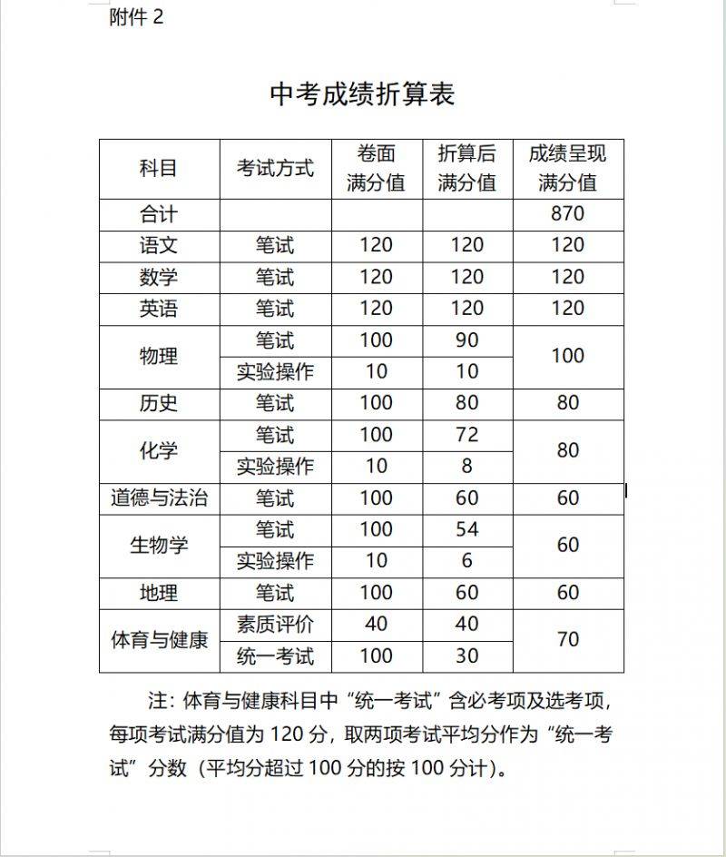 (一)采用分数形式呈现的语文等10门科目考试成绩分别按不同的权重比例折算后计入中考总分,折算后中考总分为870分,其中语文、数学、英语各120分;物理(含实验操作)100分;历史、化学(含实验操作)各80分;道德与法治、地理、生物学(含实验操作)各60分;体育与健康70分。各科目卷面满分值及折算后满分值见附件2。