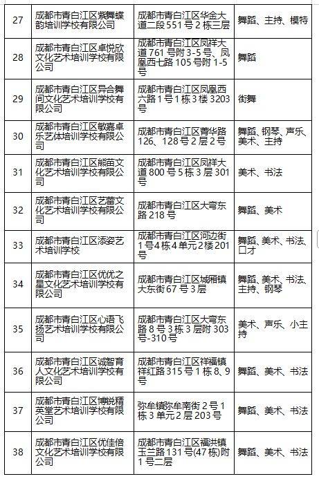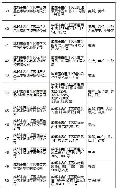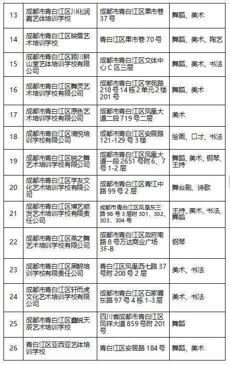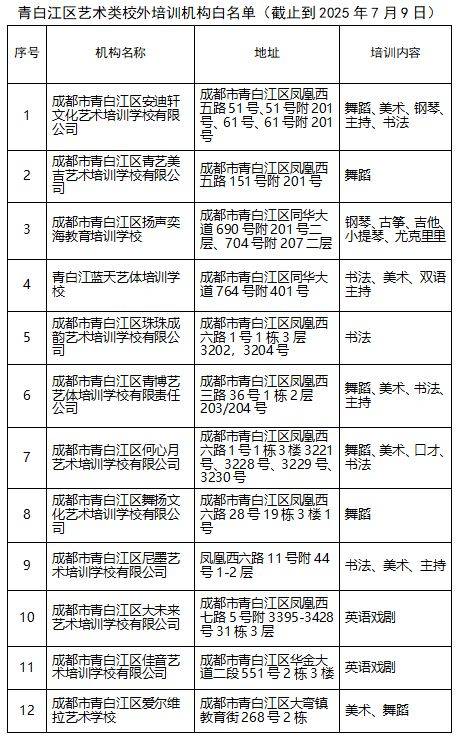 2025年成都青白江区艺术类培训机构白名单 温馨提示: 1.“白名单”实行动态更新(请关注后续官方发布的内容); 2.“白名单”为具备办学资质的合规机构,仅供选校报课参考。 3. 监督举报电话: 青白江区文广体旅局 028-68936835
