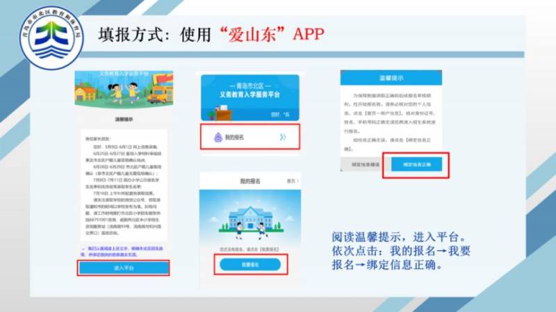 操作流程:符合报名条件的适龄儿童监护人完成“爱山东”APP注册及身份认证后,登录“市北区义务教育入学服务平台”进行入学信息采集。