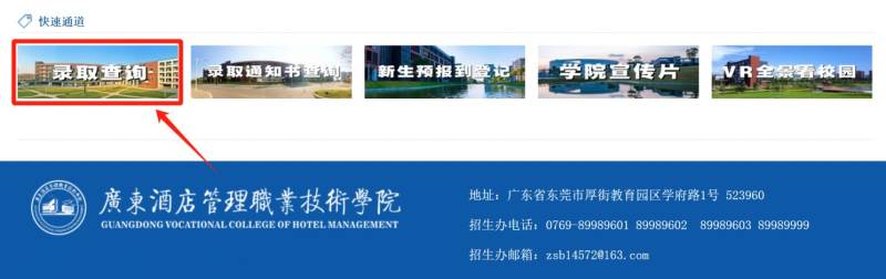 ①点击进入:广东酒店管理职业技术学院招生信息网,在网站底部“快速通道”点击【录取查询】即可