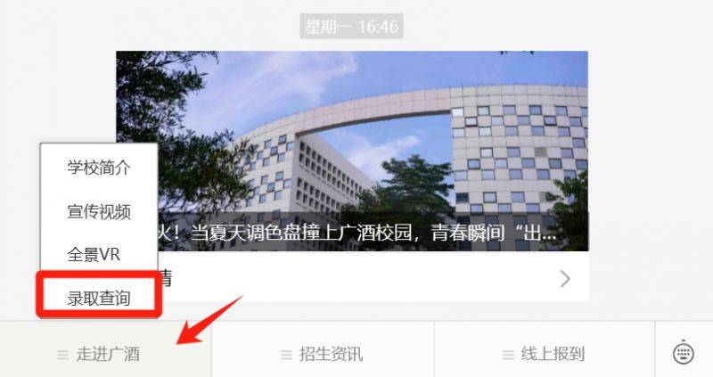 ②微信搜索关注“广东酒店管理职业技术学院招生处”,点击底部菜单栏“走进广酒”——“录取查询”即可