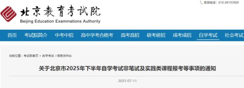 北京市高等教育自学考试自2025年起执行新专业考试计划,按新课程安排考试。现将北京市2025年下半年高等教育自学考试非笔试及实践类课程报考相关事项通知如下: