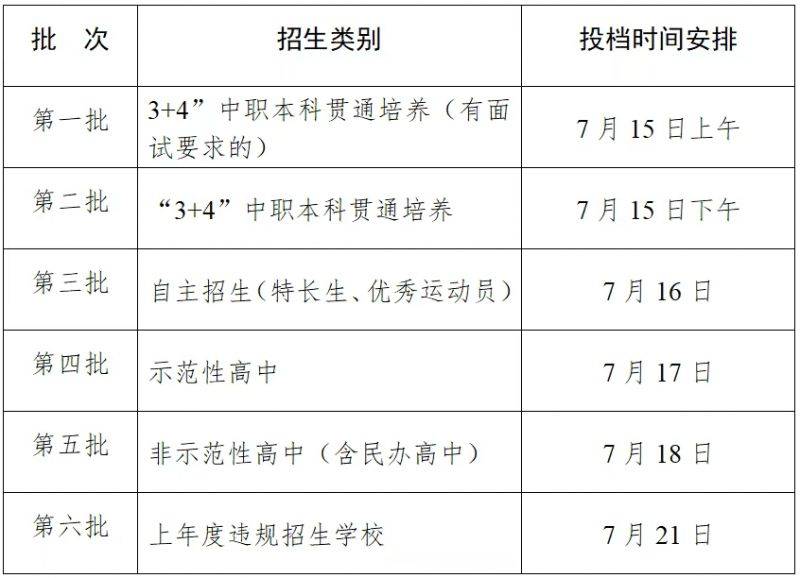| 提前批次普通高中、一类省级示范性高中统招生、一类省级示范性高中配额生、其他省级示范性高中统招生、其他省级示范性高中配额生批次 | 7月16日—7月18日 |