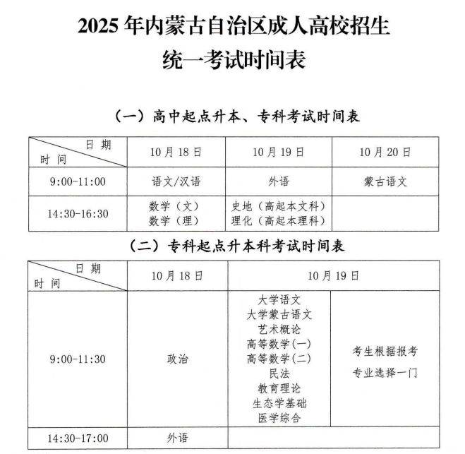 2025年全国成人高校招生统一考试时间为10月18日至19日;10月20日,我区报考蒙语授课高中起点的考生需参加蒙古语文科目考试。具体考试时间详见下表。