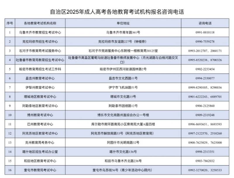 10月10日12时起,完成报考审核、缴费的考生在新疆教育考试院官方网站自行下载打印准考证。自治区2025年成人高考全疆共设16个考区,考点设在各地、州、市人民政府(行署)所在地的国家教育考试标准化考点。考生所选考区一经确认无法更改,因考区选择错误无法参加考试的考生,责任由考生个人承担。最终考点以考生《准考证》信息为准。