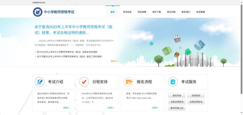 准考证下载打印入口:报名成功的考生于规定时间内容可登录报名网站下载并打印准考证,按准考证上的要求参加考试。中小学教师资格考试网(http://ntce.neea.edu.cn)