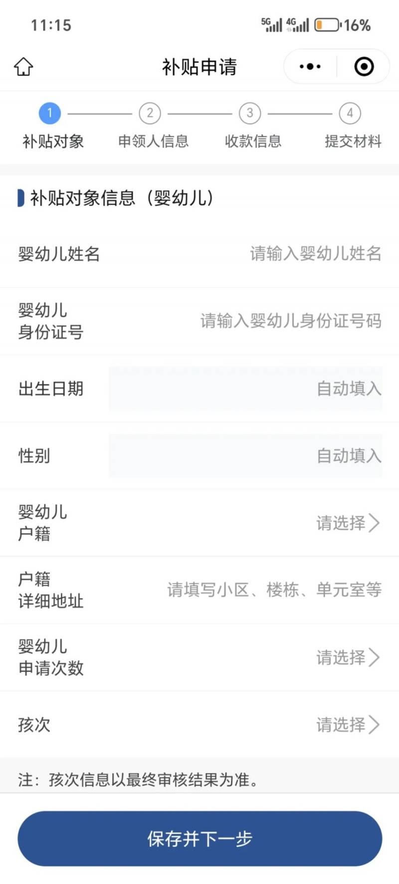 流程:填写补贴对象(婴幼儿)信息→填写申领人相关信息→填写补贴收款信息→上传相关材料→申领人确认提交