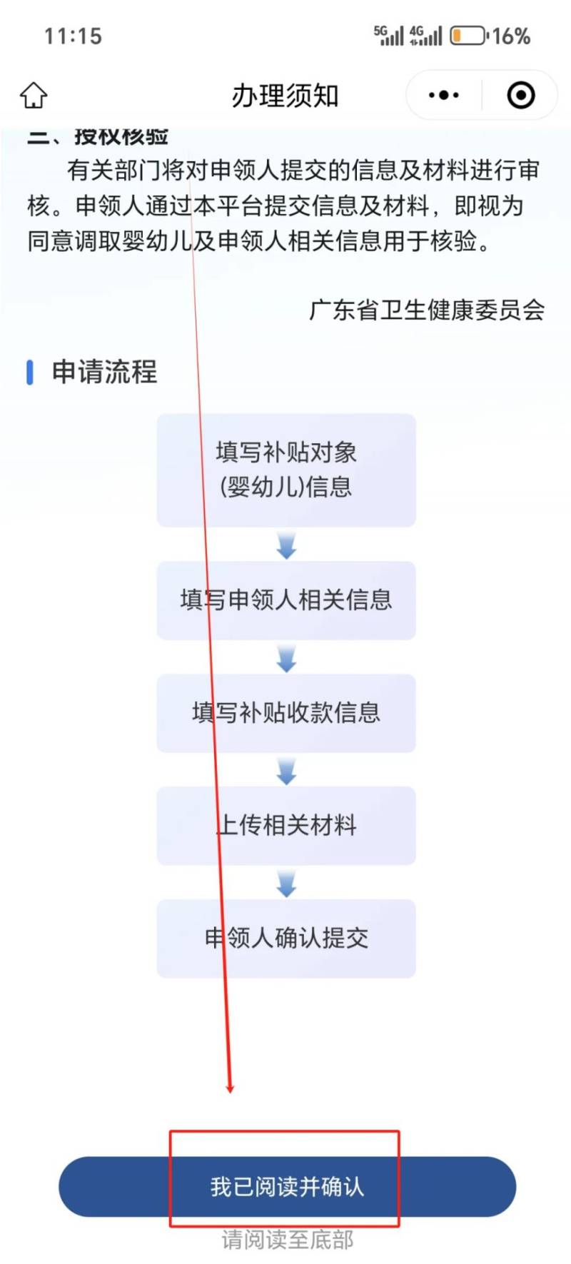 第二步,进入首页,点击【我要申请补贴】按钮,进入阅读办理须知页面。申领人须阅读办理须知,阅读完成后点击【我已阅读并确认】,进入到补贴申请录入页面。