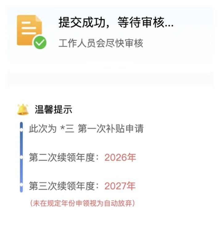 第四步,根据页面要求填写完成,确认提交后会看到提交成功的提示,代表申请单已提交,等待工作人员审核。提示内容包括下一次续领年度。