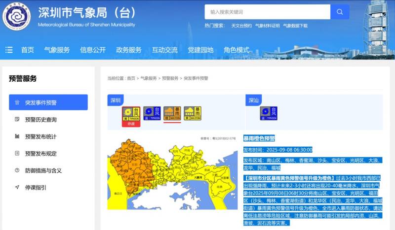 【深圳市分区暴雨黄色预警信号升级为橙色】过去3小时我市西部已出现强降雨,预计未来2-3小时还将出现20-40毫米降水,深圳市气象台2025年09月08日06时30分将南山区、宝安区、光明区、福田区(沙头、梅林、香蜜湖街道)和龙华区(民治、龙华、大浪、福城街道)暴雨黄色预警信号升级为橙色,全市进入暴雨防御状态,请远离低洼易涝等危险区域,注意防御暴雨可能引发的局部内涝、山洪、滑坡、泥石流等灾害。