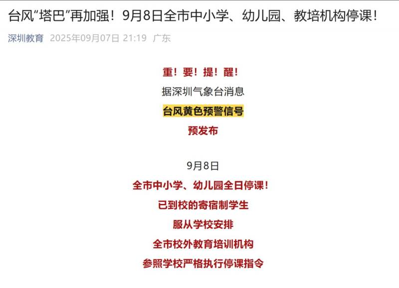【深圳市分区台风蓝色预警信号升级为黄色】预计受台风“塔巴”影响,7日后半夜至8日我市风雨逐渐明显,累计可达暴雨局地大暴雨;最大阵风沿海、海区9-10级,高地11-12级。经综合研判风雨影响,深圳市气象台2025年09月07日23时将东、西部海区、大鹏、盐田、南山区(南山、南头、蛇口、招商街道)和宝安区(新安、西乡、福永、沙井、航城、福海街道)台风蓝色预警信号升级为黄色,信号将持续到8日下午,请注意做好台风和暴雨的防范工作。根据《深圳市气象灾害预警信号发布规定》和教育局通知,9月8日全市(不含深汕)中小学、幼儿园全日停课,已到校的寄宿制学生服从学校安排,全市停止涉青少年的培训等活动。
