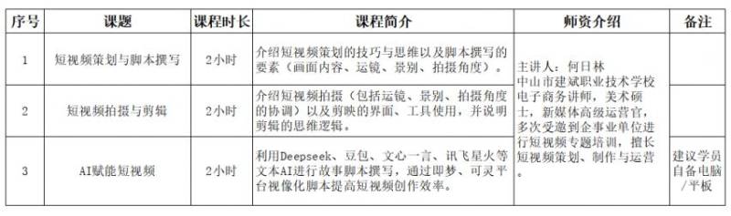 共设“短视频拍摄与剪辑”“智能办公与摄影摄像”“AI 应用”“平面设计”“商务礼仪”五个主题,16个课程选项。