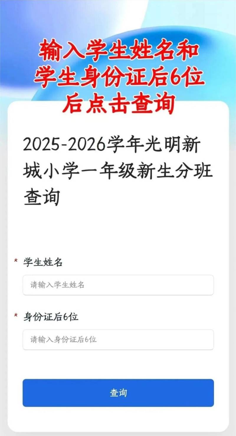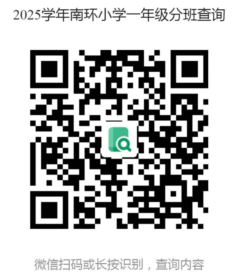 识别图中二维码,即可进入一年级分班查询系统。输入孩子的姓名和身份证号查询孩子的分班情况。