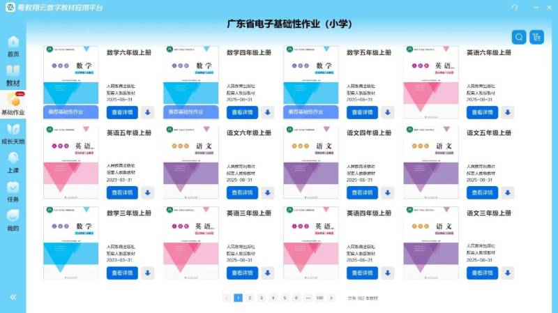 师生在粤教翔云数字教材应用平台(以下简称“平台”)官网“应用下载”中选择教师身份(windows端/小程序端)或学生身份(windows端/安卓端/iOS端/小程序端)后,可下载安装所需客户端。登录客户端后,即可在“广东省电子基础性作业(小学)”(以下简称“基础性作业”)中获得包含语文、数学、英语三个科目的全部基础性作业。